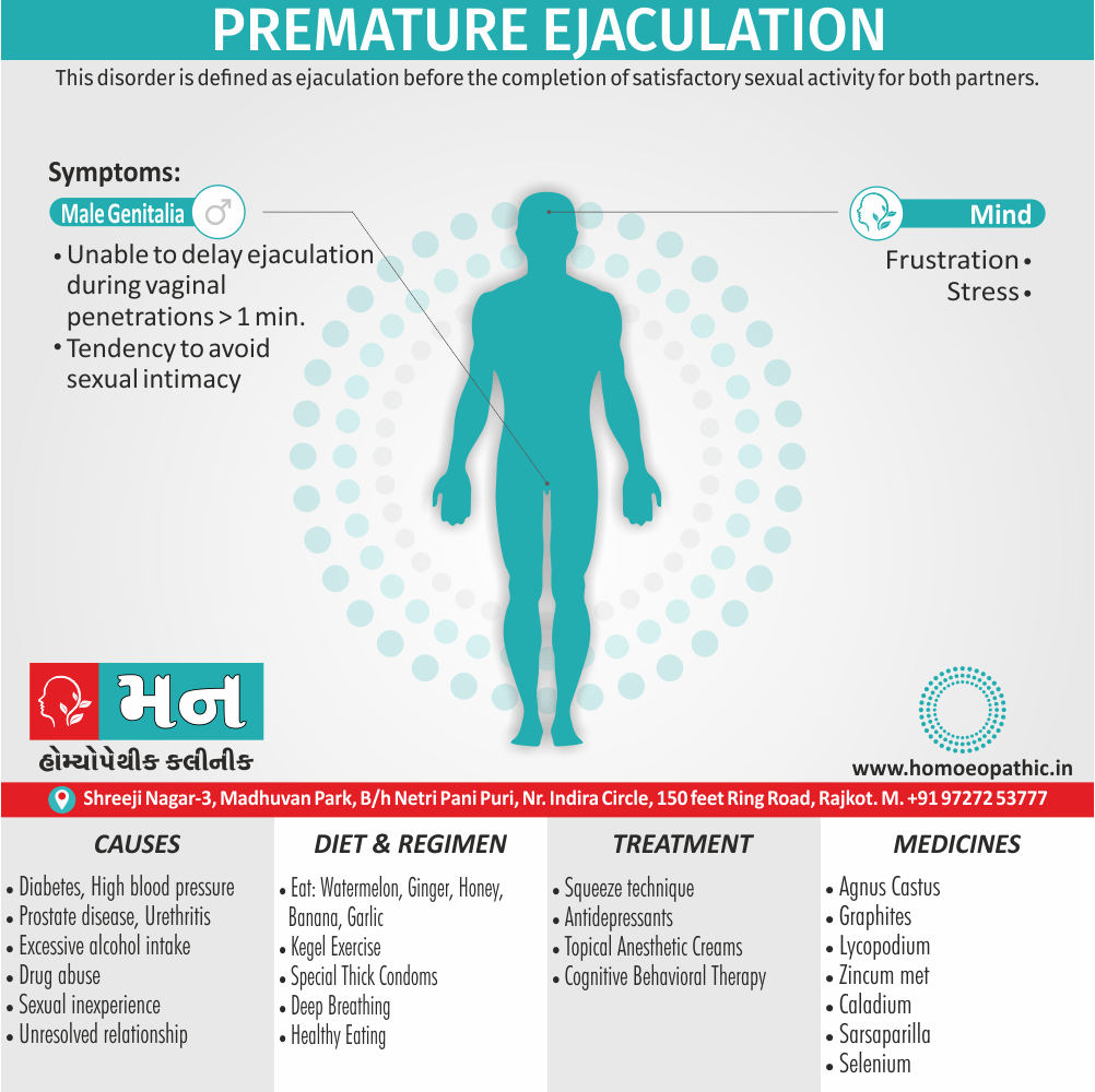 1. ऐसी स्थिति जिसमें व्यक्ति शिश्न (Penis) को योनि में डालने के पश्चात् 30 सैकेण्ड में ही वीर्य स्खलित कर दे।